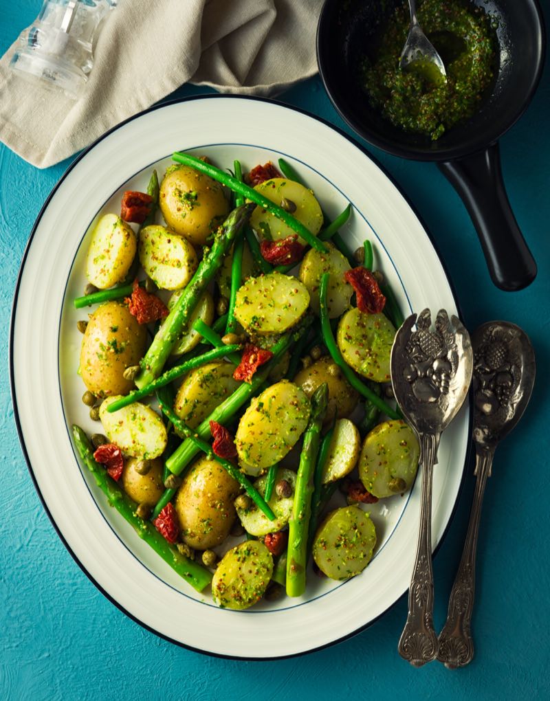 To assemble, simply arrange the asparagus and spring onions on two serving plates. Drizzle over the herb dressing and slice each egg in half before placing on top of the vegetables. Decorate with pea shoots or more fresh herbs.